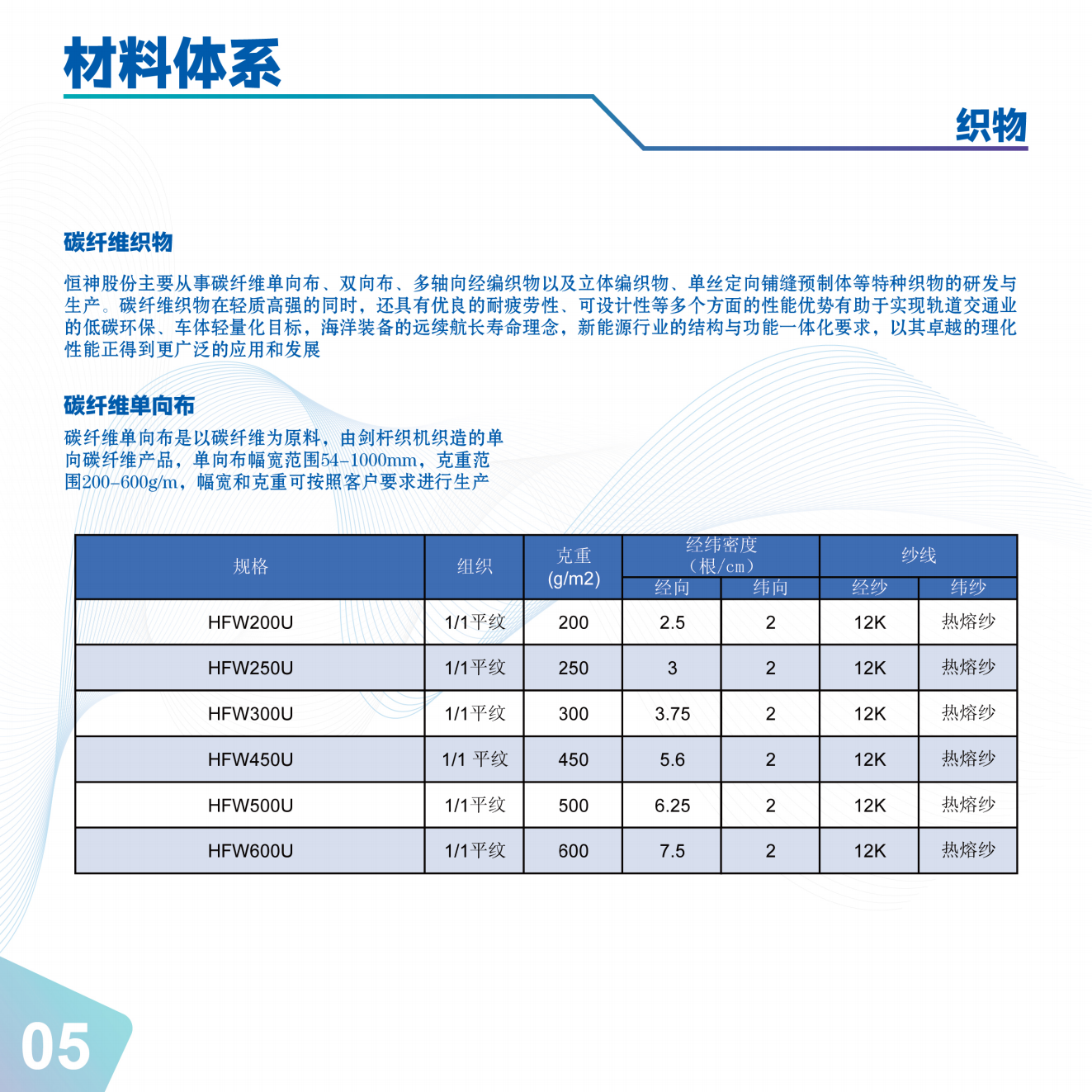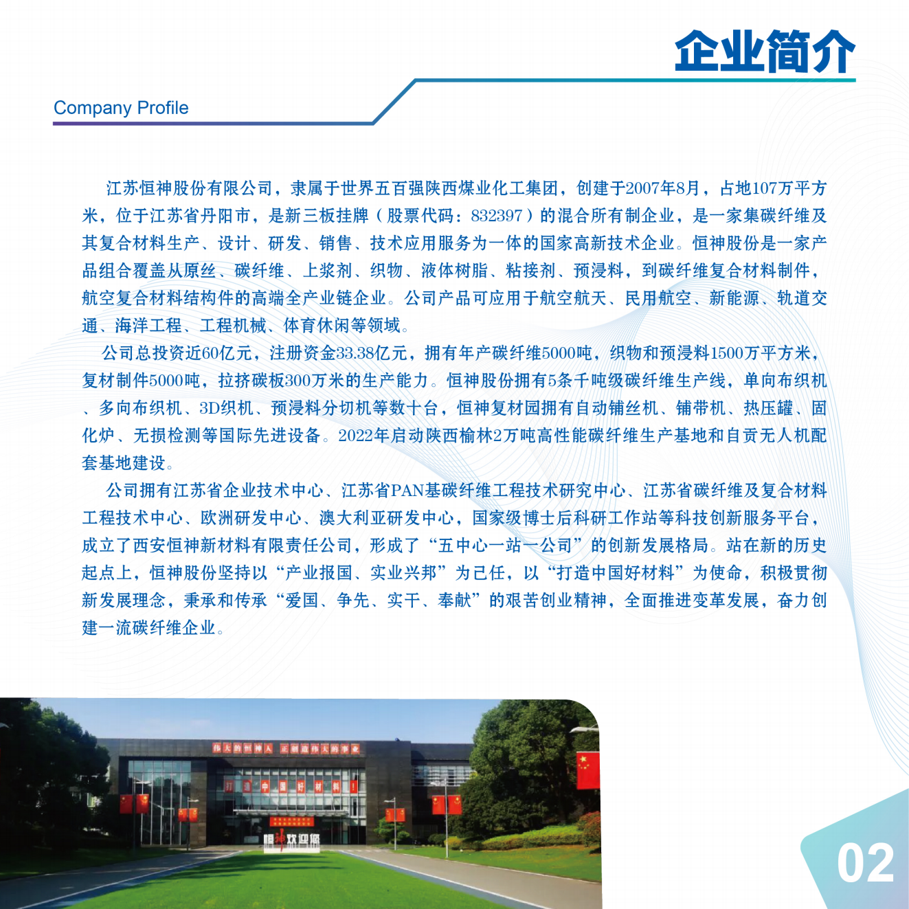 江蘇恒神股份有限公司,創(chuàng)建于2007年8月,占地954畝,位于江蘇省丹陽市,新三板掛牌(股票代碼:832397),是一家集碳纖維及其復合材料生產(chǎn)、設計、研發(fā)、銷售、技術應用服務為一體的國家高新技術企業(yè),隸屬于世界五百強陜西煤業(yè)化工集團。產(chǎn)品組合覆蓋從原絲、碳纖維、上漿劑、織物、液體樹脂、粘接劑、預浸料,碳纖維復合材料制件,航空復合材料結構件的高端全產(chǎn)業(yè)鏈企業(yè)。公司產(chǎn)品可應用于航空航天、民用航空、新能源、軌道交通、海洋工程、工程機械、體育休閑等領域。產(chǎn)品型號包括高強碳纖維如:HF20系列(T300級)、HF30系列(T700級)、HF40系列(T800級)、HF50系列(T1000級)及高強高模HM系列。產(chǎn)品規(guī)格包括:1K、3K、6K、12K、24K和50K 等。