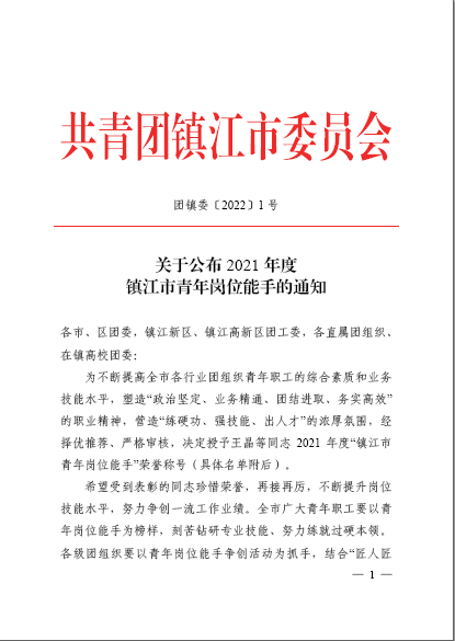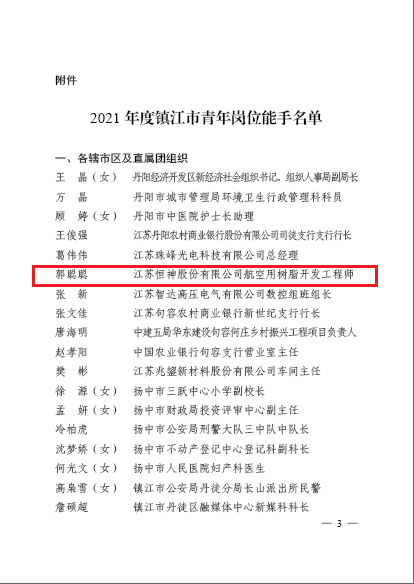 為不斷提高全市各行業(yè)團組織青年職工的綜合素質(zhì)和業(yè)務技能水平,塑造“政治堅定、業(yè)務精通、團結(jié)進取、務實高效”的職業(yè)精神,營造“練硬功、強技能、出人才”的濃厚氛圍,經(jīng)擇優(yōu)推薦、嚴格審核,恒神股份研發(fā)工程師郭聰聰榮獲“2021年度鎮(zhèn)江市青年崗位能手”稱號。
